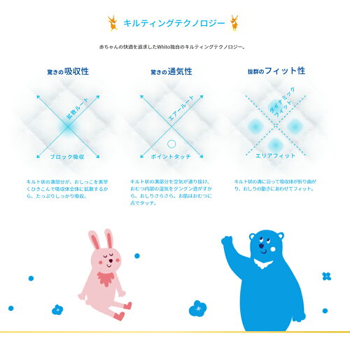 こまめに替えたい昼に3時間用 ・赤ちゃんの快適を追求したキルティングテクノロジーで驚きの吸収性2倍!通気性2倍!※ ・赤ちゃんの快適は1つじゃないから、「3時間用」と、「12時間用」のうれしい使い分け。