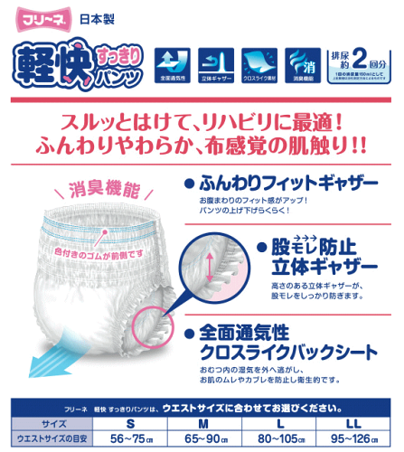 製品仕様 商品名 フリーネ 軽快すっきりパンツ サイズ・入り数 S:(ウエストサイズ)56〜75cm/22枚入り M:(ウエストサイズ)65〜90cm/20枚入り L:(ウエストサイズ)80〜105cm/18枚入り LL:(ウエストサイズ)95〜126cm/16枚入り 吸水量 目安吸収量300cc(おしっこ約2回分) 商品説明 尿パッドを併用しても、はき心地スッキリ! スルッとはけて、リハビリに最適! ○ふんわりフィットギャザー お腹まわりのフィット感がアップ ○股モレ防止立体ギャザー 高さのある立体ギャザーが股モレをしっかり防ぎます。